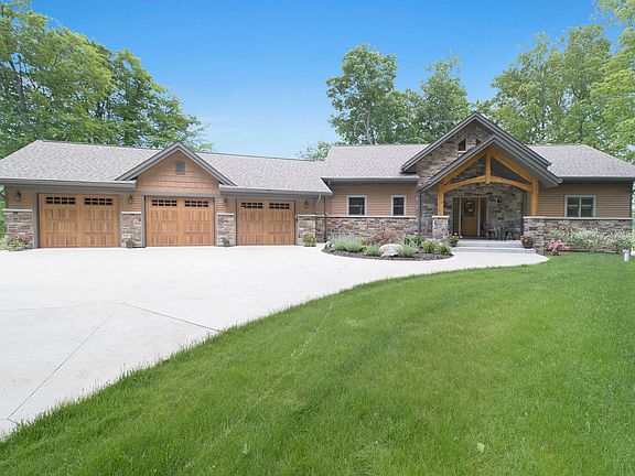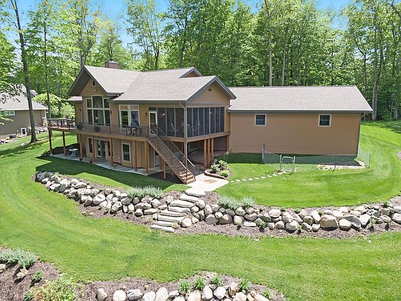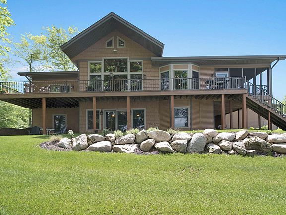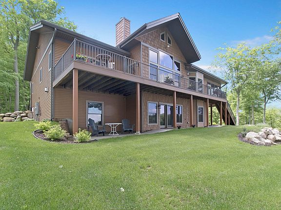 Custom Timber Frame walk out ranch home built in 2016, 3500 sq ft. designed by specialized Timber Frame company. 1st floor Master Suite, walk-in closet, large master bath, soaking tub,walk-in shower. Great Room with kitchen & dining room in open area with exposed Timber Trusses, Pine ceilings, Hickory doors, floors & cabinets, beautiful floor to ceiling stone fireplace. Large windows in both areas give a panoramic view of Big Lake. More views on the screened porch off the kitchen & a deck runs length of the house. Butler's pantry, powder room, laundry/mudroom, 3 car garage. Walk out level has large family room w/ panoramic lake view, gas fireplace, kitchenette/bar, 3 bedrooms, 1 ½ baths, storage/ mechanical room, outdoor seating areas with lake views. 60 ft lake frontage & boat dock.