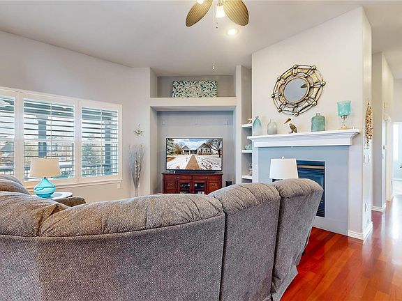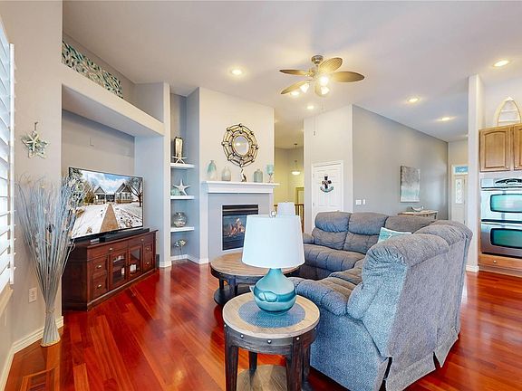 - Description: Brazilian Cherry Wood Floors - Plantain Shutters - Gas Fireplace