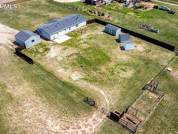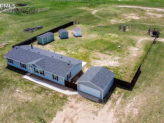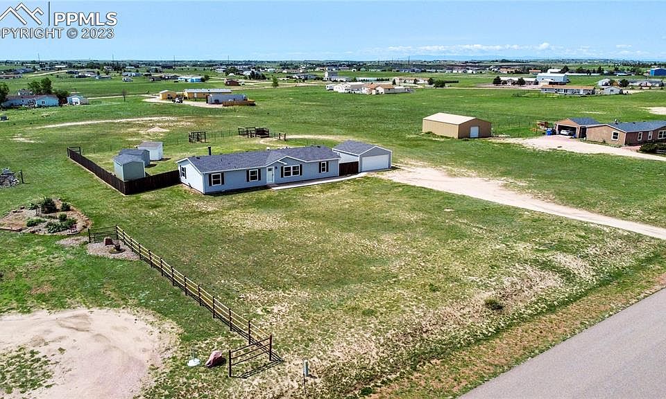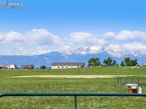 Your search for that special home on acreage is over. Main level living rancher positioned on 2.58 acres tucked on a quiet cul-de-sac in an equestrian friendly community only minutes from all of the amenities you need in Falcon! Panoramic Pikes Peak and mountain views with incredible sunsets. This one owner, well maintained home has new high quality carpet, the roof was replaced in 2017, new siding and energy efficient windows installed 2018. Here you can have those fun farm animals you have been dreaming of - horses, chickens and goats are all welcome. Outbuilding and RV friendly. The home has large windows, vaulted ceilings throughout and a wood burning fireplace. The kitchen is open to the dining room and features a newer stainless gas double oven and sizable pantry. Primary bedroom with walk-in closet, private bath and direct entrance into the laundry room. Large 2 car detached garage. Huge fenced backyard with three sheds, large patio and a fenced garden area. Complete main level living with 4 bedrooms and almost 1,800 square feet. All paved county maintained roads to the property. District 49 Schools. Great access to Highway 24 and Woodmen Road. Short drive to Peterson AFB and Schriever AFB.
