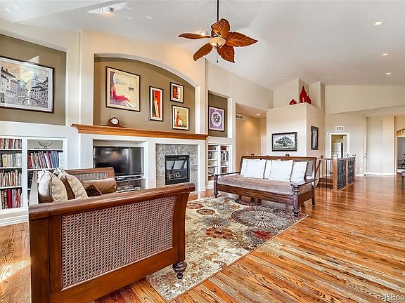 Welcome to Heritage at Todd Creek, an active adult community with clubhouse, park, restaurant, activites, walking trails, pool, and golf course! This beautiful home is situated on the golf course (away from errant golf balls) with a stunning view over the course toward the mountains. Vaulted/high ceilings, open floorplan, and ample windows provide plenty of space and natural light. The gourmet kitchen features cherry cabinets, solid granite counters, double in-wall oven, French gas cooktop, SS appliances and a generous pantry-plus easy access to the dining area with coffered ceiling. The living room is open and includes built-ins, gas-log fireplace, and large picture window where you will enjoy the beautiful mountain and golf-course view. The large master bedroom has a 5-piece bath, stone tile counters, large walk-in closet, and private door to the back patio. The guest bedroom has its own full bath, walk-in closet, and is privately situated. The generously sized main-floor office opens with French doors. In the basement you'll find the recently finished bonus room perfect for games, movies, or simply relaxing. Beyond the barn door is a huge storage area plus space for a shop and/or additional bedroom and bath (rough-in). Upgrades include beautifully finished hardwood floors, plantation shutters, electronic window blinds, covered patio (with patio shade) and front porch, central vacuum, wired for sound (inside and patio), whole-house humidifier, plus a radon-mitigation system. The sprinkler system uses non-potable water (no backflow system) = simple winterization (no line blow-out needed!). The home enjoys extremely low energy bills (very energy efficient) and has been meticulously maintained. The oversized 3-car tandem garage is ideal for your golf cart and extra storage. A First American Buyer's Warranty (Basic + AC) is included.
