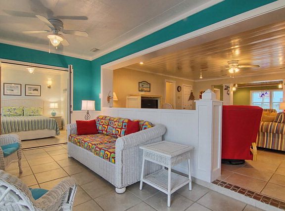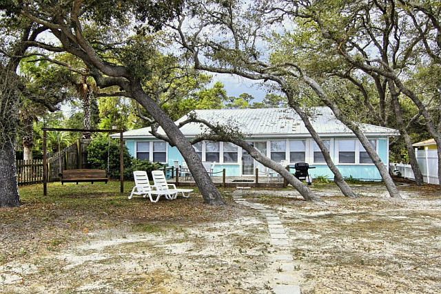 Spacious waterfront home,great condition,gorgeous Lagoon views, newly painted inside & out. PRICED TO SELL. 2300 sq ft ground level main house, has 3 master suites plus sunroom. Beautifully decorated and sold fully furnished. New pier, 2 bulkheads, deck,tile floors, wood ceilings and beadboard. 1/1 guest house/garage apartment(unfurnished)has an additional 705 sq. ft. Perfect for full time home or income property. Covered parking and lots of storage. Beautiful trees! Across from Peninsula Golf
