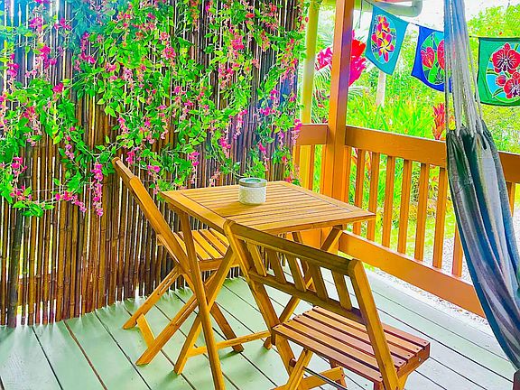 Peaceful, fully furnished studio cottage surrounded by tropical greenery. Includes queen-size bed, 32" Roku Smart TV (Spectrum, Netflix, HBO Max), internet, water, electricity, and trash. Private lanai, indoor shower, as well outdoor shower. Kitchenette with cooktop, microwave, mini fridge and all essentials.