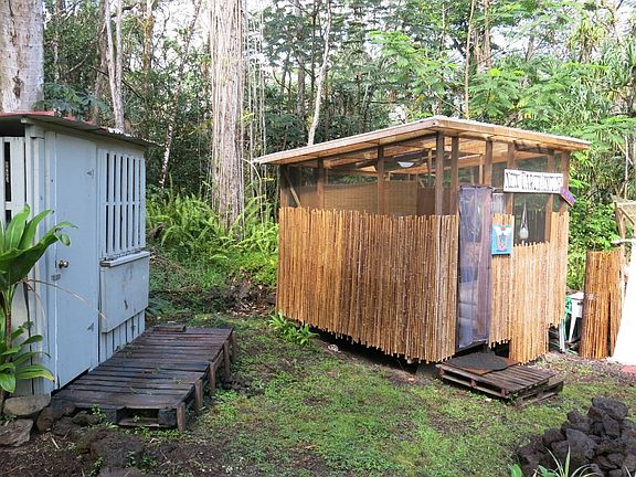 a 10x12 cabin constructed of new 2x4's and bamboo, a small storage shed made of recycled painted pallets and a smaller "outhouse" style structure. Seller is also selling the lot directly behind it (see MLS#666283) for an additional 1/4 acre giving you about 1/2 acre of land total on the Beautiful Big Island ! This area "Hawaiian Shores" is popular due to: