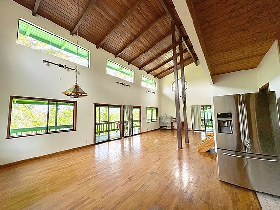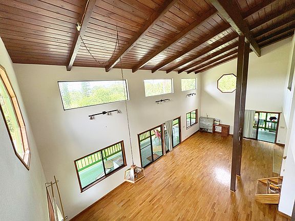 Modern comfortsRustic eleganceHigh vaulted ceilingsWood floorsWell appointed kitchenMature fruit treesLarge covered lanai