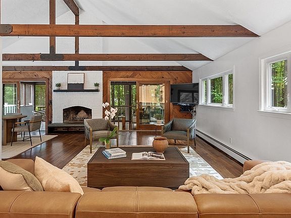 Update: Offers, if any, due Mon, Mar 3 at 5p. Experience the cool vibe of this significantly updated & open concept Contemporary home on 6+ enchanting acres. At the end of a private rd, sits this Biophillic-designed home that seamlessly blends w/ its natural environment. Beautifully showcased throughout are thoughtful improvements made incl an updated kit, new & refinished hardwood flrs, reimagined foyer & staircase, updated decks, landscaping & freshly painted rms. On the main flr, a focal point of the great rm is a statement fireplace flanked by sliding drs to the 3 season rm which evokes the feeling of a breezy tree house.The updated primary suite w/ vaulted bath ceilings & private deck offers breathtaking views of the rear lawns. 3 updated bdrms & full bath w/vaulted ceiling complete this level. Downstairs, enjoy the media rm w/ wood stove, lg office/flex space w/new closet that could be used as a 1st flr bedr, foyer, powder rm & mud/laundry rm. Oversize garage. Excellent schools!