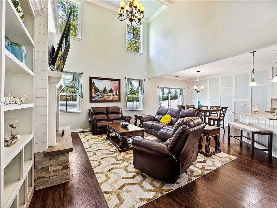 This stunning custom residence features numerous upgrades like elegant fireplace built-ins, crown molding, & shiplap accents. The extended driveway offers convenience, and the first-floor primary suite provides privacy. Upstairs, you'll find a loft/flex space with 3 spacious bedrooms with custom built office nook. Enjoy serene wooded views from your private fenced yard, perfect for outdoor activities. Just a short walk to New Riverside Village with shops, restaurants, spa & more. Nearby Riverside Barn Park has trails, a playground, & picnic areas. This home offers luxury living in a peaceful setting! Ask about closing cost assistance!