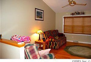 Immaculate 4 bdrm, 3 bath ranch has much to offer! Maintenance free ext. Sits on double lot, backs to woods, almost an acre. Close to shopping, schools, thruway. Open floor plan, newer carpet, gleaming hrdwoods, ceramic foyer. Lrg. kitchen has built in desk area. Cathedral ceiling in great room, sliding glass door off kitchen to deck overlooking private yrd. Master bdrm w/bath & lrg walk-in closet. Impressive walkout bsmt completely finished, slider to patio, in-law potential as it incls. kitch/fam. rm area, 1 bdrm & full bath. Approx 2300 sq ft w/finished bsmt. 2 car gar. w/opener