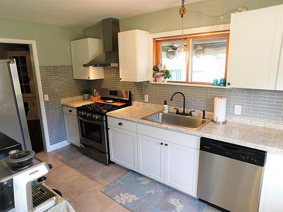 Move in condition home. Sellers have updated the kitchen with vinyl tiled floor, counters and appliances. Dining room with large pantry and corner built-ins. Sunroom with updated windows and door and updated hot water baseboard heating. Bedroom has double sinks and vinyl flooring. Two nice sized bedrooms. Master bedroom closet very well designed. Large living room with Large picture window. The lower level includes exercise room, utility room, large washroom and extra storage areas. Large detached garage with extra storage in front portion. Cozy patio with stone pavers. Level lot. There is also a large storage shed that will remain. Sellers have updated roof, electrical and most plumbing. Do not miss out on this home. Call today!