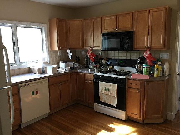 Sunny top floor of triple decker. Newly renovated w/ gleaming hardwood floors. Modern kitchen (with D/W & Disposal and built in Microwave, Fridge,). 2 modern bathrooms, 3 good size BR's plus one enormous master bedroom ( 12'x18') with a large closet and study off it ( the study is 6'x12'). The apartment has it's own private high efficiency washer/dryer in the basement ( non-coin op). There's a grape Arbor over the driveway with space for bbqs. (Reference #132385)