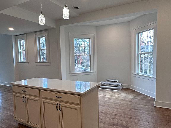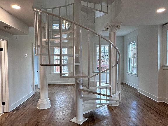 This stunning, 2-story, 3.5BR/2Bath apartment is located in historic Corn Hill, a residential oasis in the heart of downtown Rochester. Situated on the second floor of an 1832 Victorian-style house, the unit features unique architectural details including a spiral staircase, 18-ft Greek ionic columns, and dramatic high ceilings. The kitchen, dining, sitting, living room, mud room/storage, and guest bathroom are on the first floor. The large modern kitchen has an island, state-of-the-art stainless steel side-by-side refrigerator, gas stove, over-the-range microwave, and dishwasher; quartz countertops; granite composite sinks with garbage disposal. Natural oak hardwood floors throughout the apartment; marble tiled floors and marble vanities in both bathrooms.