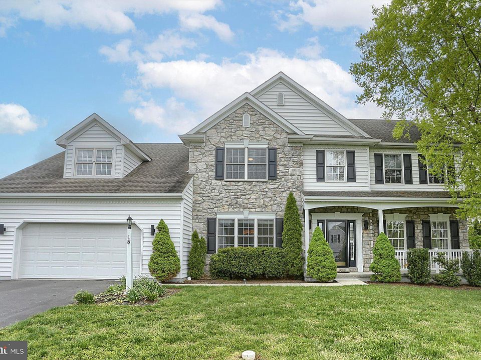 Welcome to 15 Augusta Drive in the desirable Olde Stone Way community. Situated on a quiet street, a spacious covered front porch invites you into this beautiful 4 bedroom, 3.5 bathroom home with over 3000 sf. Features include a 2-story entryway, open floor plan, 9ft first-floor ceilings, hardwood floors throughout 1st level, a large family room, stone gas fireplace, custom built-in shelving, eat-in kitchen, center island, solid surface countertops, and stainless-steel appliances. The main level also includes a formal dining room and office with double French pocket doors. Upstairs you will find the primary bedroom suite, large walk-in closet, jetted tub, and separate shower. Down the hall are three additional spacious bedrooms, a Jack and Jill bathroom, and a 3rd full bathroom. Enjoy time on the new back deck overlooking the level, .41 acre lot, fenced backyard with mature landscaping. Huge 4-car garage with double doors to the backyard! Basement walls and floor have been sealed, ready to finish, and includes an exterior entrance. Palmyra Area School District! Schedule your tour today!
