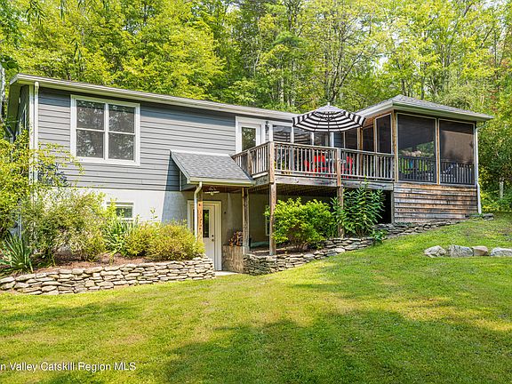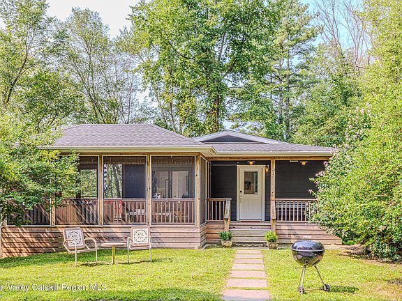 This light-filled, modern home is located on Bakertown Road in Accord, NY - one of the most bucolic country roads in all of Ulster County. Situated on 1.22 wooded acres, this fully and perfectly renovated home is currently set up as a gracious two bedroom, one bath cottage, but can easily be expanded to add an additional guest room and bathroom within the same floor plate (as seen on alternate floor plan). This charming residence features cathedral ceilings, a gourmet kitchen, beautiful finishes throughout, year round HVAC system, a massive screened-in outdoor porch, a fully finished, windowed, walk-out lower level with wood burning stove/fireplace, and Hardie Plank exterior siding.