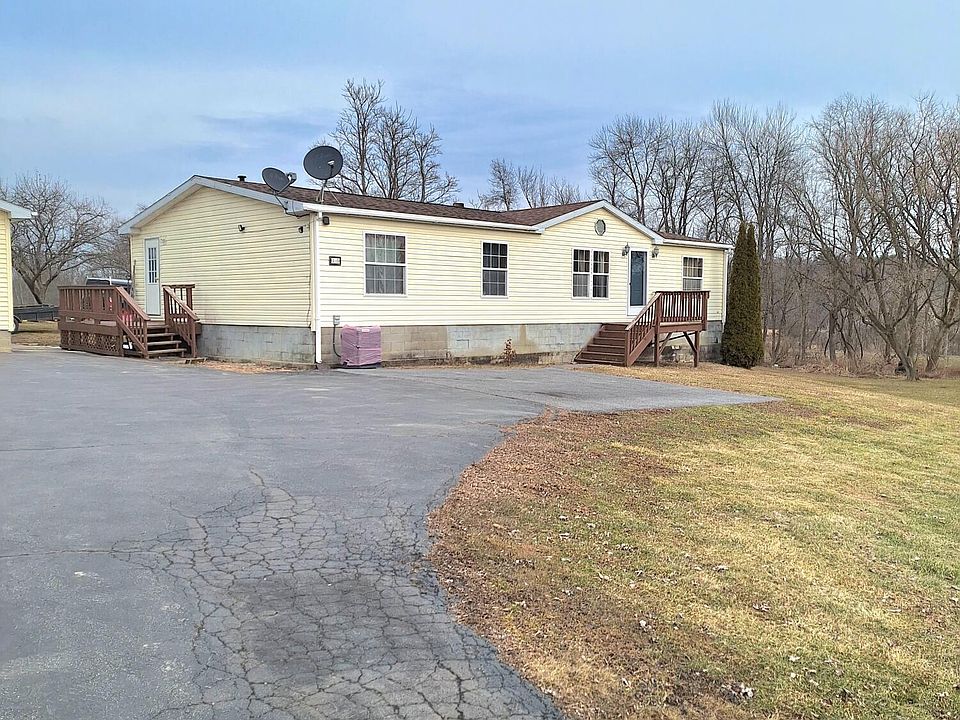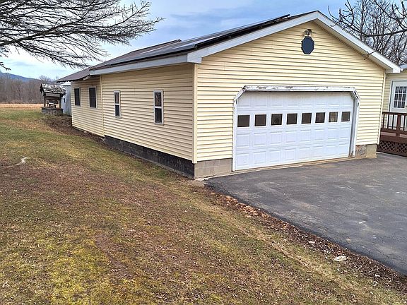 Great country location with some awesome views .This is a 3 Bedroom 2 bath mobile home on over an acre of land and sitting right next to the bike trails.Having a large open floor plan with cathedral ceilings and a gas fireplace makes it cozy and ready for entertaining. A large primary bedroom with it private bath and dual closets but don't forget the large garden tub and a seperate shower ,This home has a generator wired to just plug in when needed ,solar bought and paid for so NO national Grid Bill!!!!,It even has central air ,inside surround sound for music and a Large back porch .Drive down the paved driveway to your oversized double garage with a 3rd bay behind it, heated and plenty of room for your toys or wood shop.. Don't just drive by come and see this today.