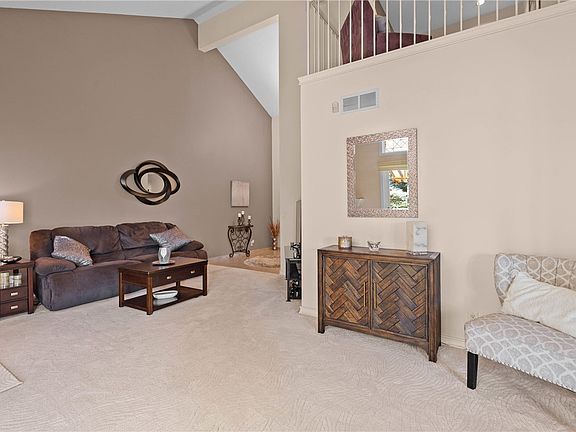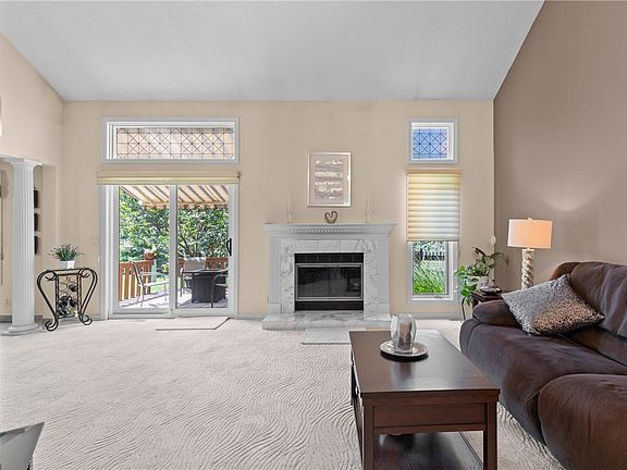From the moment you enter, you’ll be drawn in by soaring vaulted ceilings and plush deluxe carpeting that set the stage for warm, inviting living. The living room is a true showstopper—expansive, open, and centered around a woodburning fireplace with a charming hearth, perfect for cozy evenings. A sliding glass door leads you to the awning-covered deck, an ideal spot for morning coffee or relaxing at the end of the day.