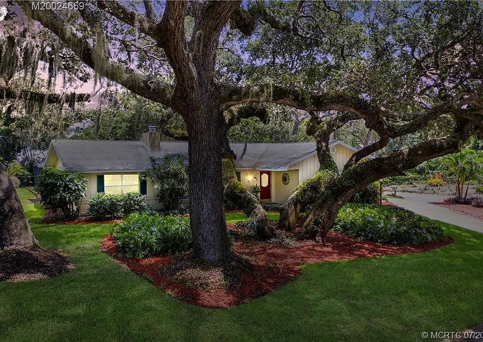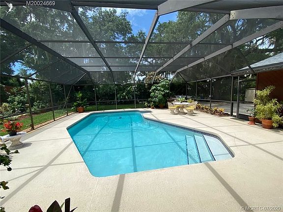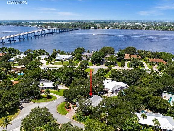 Sewall's Point located on High Elevation lot (Not in Flood Zone). Magnificent Ancient Oaks are focal point of the landscape. Pride of ownership obvious in well cared for CBS 4 BR/3BA home with circular drive to 2 car garage, a separate drive to the rear to hide boat/trailer. GREAT SPLIT FLOORPLAN, Major rooms have direct pool access. Kitchen has real Cherry cabinetry w/ soft close doors/drawers & dovetail drawers, SS appliances, pass thru to pool. Spacious family room open to kitchen w/ breakfast bar. Master suite w/ ample walk-in closet, separate dressing area, & updated tile. Guest wing has 3 Bedrooms (2 are Jack/Jill) & 2 more Bathrms. Formal Living room via foyer entry, w/window wall & stone fireplace. The pool was refinished 3 years ago-irregular shape with swim out, large screened en