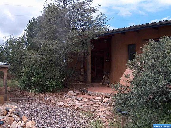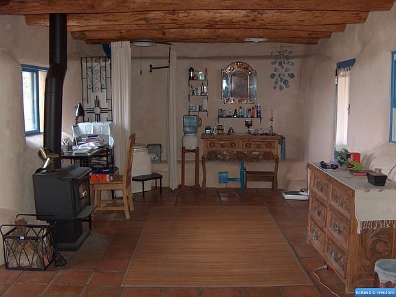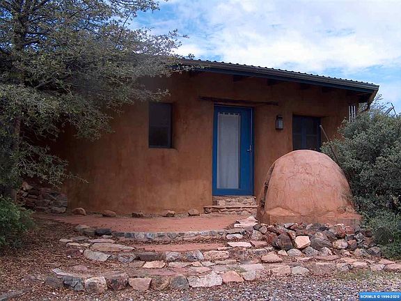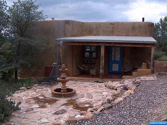This unique home is an Earthship. The construction is tires and mud with concrete facing. It is self-sustainable living. Solar power, water cistern system, 2 composting toilets. One room is constructed with straw bale construction. The home has a living area, kitchen, detached master bedroom and a guest bedroom attached to the main house with an outside entrance. The home is heated with wood. The water system is an indoor cistern holding. The kitchen has a water filtering system under the sink. The main house has a shower and composting toilet. The master bedroom (detached) has a sink and composting toilet, small green house area, and wood stove. Most of the furniture will stay, only a few special pieces will be removed. This home needs repairs. Roof need repairs. Offers considered!
