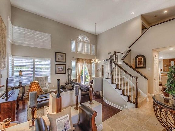 A wonderful place to call home. Its elegant double door entry opens up to a bright and airy home with high vaulted ceilings and walls filled with large windows. Immediately, you will be greeted with a formal living room and dining area with dark hardwood floors and french doors that lead into the backyard. The gourmet kitchen has rich wood cabinetry, granite countertops, stainless steel appliances and sink that offers a view to the backyard, a large oversized island with a stove, extra storage and wine refrigerator and opens up to a large area with a fireplace and built-in speakers that you can use as a family room or dining area. Also on the main floor is a guest bathroom and attached 3-car garage with laundry hookups. All 4 bedrooms are carpeted and located upstairs with 1 master and 2 additional bathrooms. The master suite is privately situated away from the other bedrooms with french doors, a vaulted ceiling, plantation shutters, a large walk-in closet, travertine surrounded large shower and separate soaking tub and dual vanity. Every single room in this entire home has been upgraded, and you will definitely notice all of the details. The backyard is truly a paradise. Enjoy your time spent out here while you're enjoying the tranquility of the custom designed spa with waterfall or the warmth of the custom built in fire pit. The backyard also has an complete outdoor kitchen with built in grill, sink and fridge. This is truly a place where you can feel like you're on vacation while you are at home. Owners pays for HOA monthly fee and Gardner.
