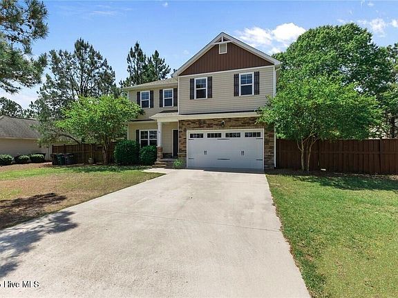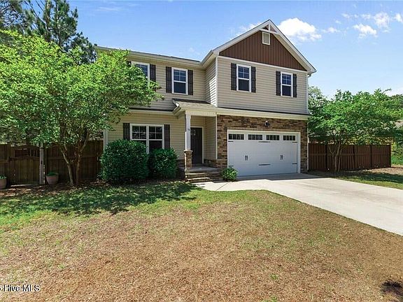 Freshly painted home with new photos. Fabulous and fresh traditional 4 bed, 2.5 bath home, move in ready, with craftsman touches in the Lake Marina area of Pinehurst! In this home you'll find gorgeous hardwood floors throughout the main floor, upgraded cabinets and sparkling granite countertops! The open floorplan flows beautifully from the family room with cozy fireplace to the kitchen featuring an island with space for two barstools, stainless steel appliances and plenty of cabinets for storage. You will also find a chic formal dining room with coffered ceilings and wainscoting. All bedrooms including the primary suite are located on the second floor, alongside the upstairs laundry room. The primary suite's bathroom features a large soaking tub and separate shower along with a double vanity. The fully-fenced-in backyard has a large deck and a fire-pit makes this a great space for entertaining! Attached 2 car garage, perfect for easy grocery load-in.