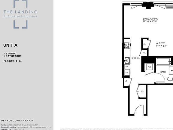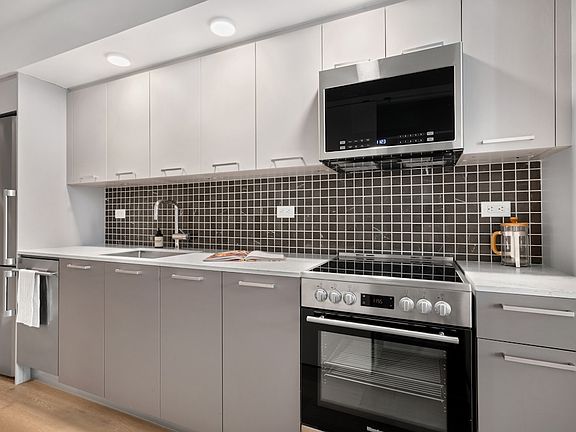 Welcome to Unit 11A at The Landing, a spacious and thoughtfully designed alcove studio that blends modern comfort with functional elegance. This sun-drenched home boasts an open-concept layout with generous living space, perfect for creating a cozy sleeping nook or a separate work-from-home area. The kitchen is outfitted with sleek stainless-steel appliances, quartz countertops, and ample cabinetry, ideal for everyday cooking and entertaining. Large windows flood the apartment with natural light, highlighting the contemporary finishes and warm hardwood flooring throughout. Enjoy the convenience of an in-unit washer and dryer, abundant closet space, and a layout that offers both style and flexibility.