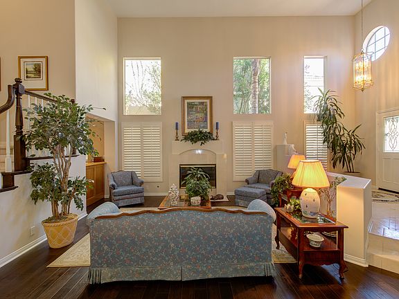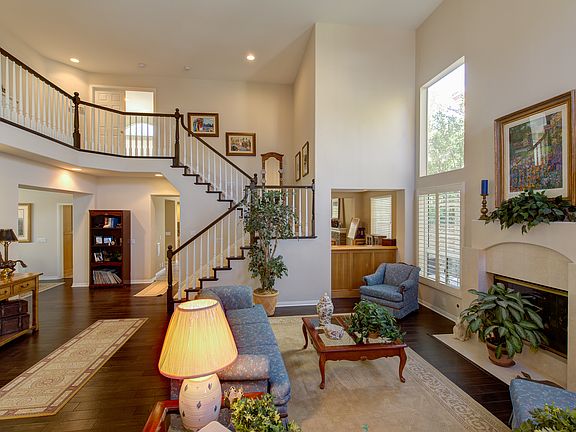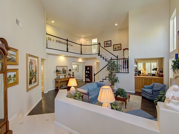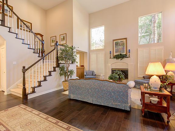 Situated in the prestigious guard gated community of Dove Canyon, this 4 bed, 4.5 bath home/bonus room, backs to the open trail area with no home behind you. Grand entrance w/double leaded glass front doors, two story ceilings, formal living room with fireplace & separate formal dining room. Recently updated gourmet kitchen offers granite counters, stainless steel appliances, double oven, & center island. Kitchen is light & bright, & opens to the family room w/stone fireplace, custom entertainment center & wet bar. Main floor bedroom, ideal for guests, includes its own bathroom. Upstairs you will find the master bedroom with fireplace, balcony & French doors with retractable screen, 2 spacious secondary bedrooms each w/their own individual bathroom, & large bonus room. Back yard, perfect for entertaining, is highlighted by a pebble tech pool with baja reef entry, spa, fire pit, overhead awning/ceiling fan, low maintenance artificial grass & built in BBQ. Key features include: hardwood floors, new dishwasher, crown molding, upgraded baseboards, ceiling fans in bedrooms, surround sound, new carpet, wood shutters, extra garage storage, new pool pump, new water softener, solar (for pool only), new water heater.