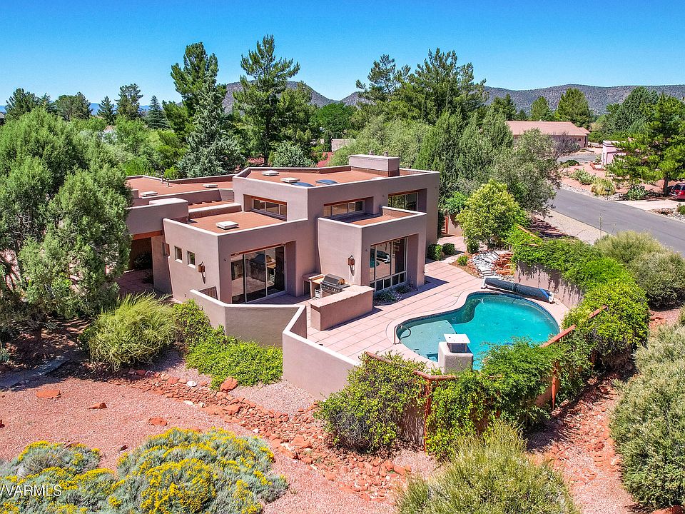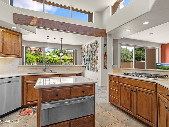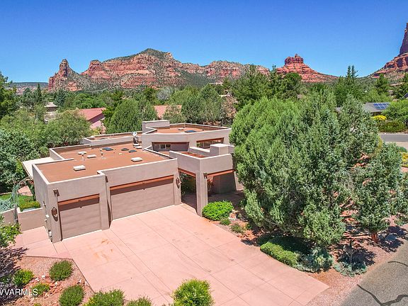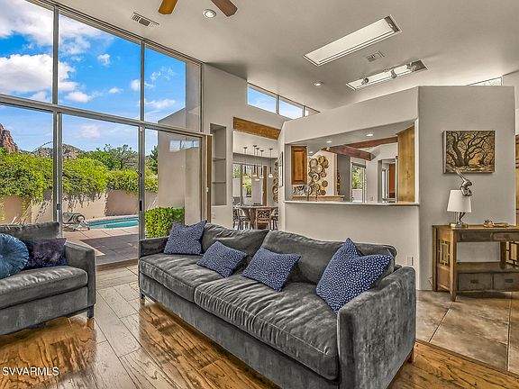 Contemporary Southwest retreat just minutes from Bell Rock, offering iconic red rock views from nearly every angle! This single-level Sedona home features soaring 12' ceilings and floor-to-ceiling windows that flood the open living area with natural light. The chef's kitchen includes quartz countertops, a 5-burner gas cooktop, wall oven, warming drawer, and wine fridge. The spacious primary suite offers a sitting area with fireplace, walk-in closet, soaking tub, and glass shower. Four private covered patios extend the living space outdoors, complete with a pool and spa with cascading water features, outdoor kitchen, fireplace, and putting green.Offered fully furnished, this private Sedona oasis includes an oversized 3-stall garage and a nearly 1/2 acre lot blending luxury with serenity.
