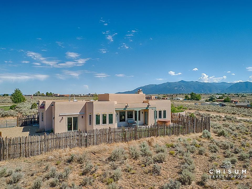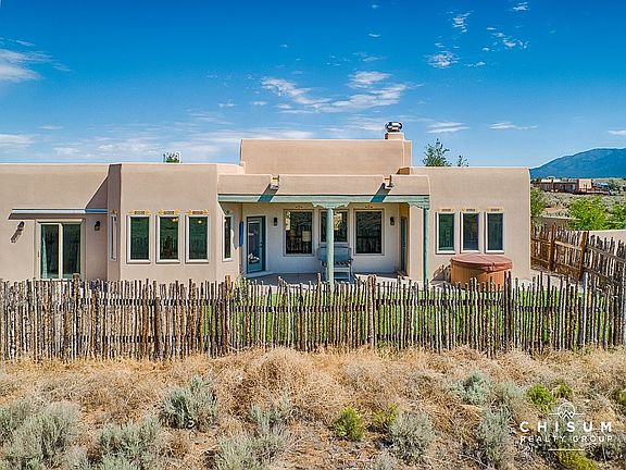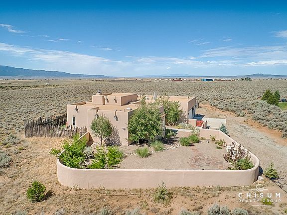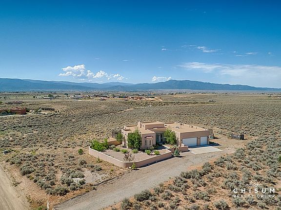Stunning southwestern home with easy access to Taos Ski Valley and the Town of Taos, welcome to 15 Calle de Dona Sinforosa. Situated on 1.2 acres, this home has unobstructed views of the Sangre de Cristo Mountains which can be enjoyed from almost every room in the house. The front of the home features a walled xeriscape courtyard with flagstone paths, a sitting area and a complete irrigation system for the vegetation and Aspen trees. Inside, you'll find an open concept home with a great room featuring soaring ceilings with arched wood beams, a large window wall and a double sided wood burning fireplace, shared with the master bedroom. The kitchen boasts a pantry, tile flooring, granite countertops and a breakfast bar. The adjacent dining area provides amazing mountain views which leads out to a covered back patio and a yard featuring artificial turf. The backyard also has a latilla fence for additional privacy. The master bedroom is spacious and includes a fireplace and an ensuite bathroom with a walk-in closet, double vanities, tiled shower, and a jetted soaker tub perfectly framed by two windows. The first guest bedroom is also on the west side of the home while the east wing contains a full bathroom, two more bedrooms and a laundry room leading to the oversized two car garage.