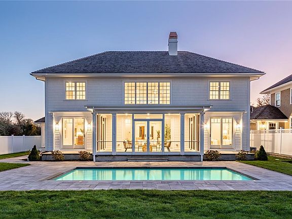 Introducing the “Cottages at Carnegie Abbey," an enclave of 5 coastal-inspired, completed new construction homes inside the exclusive guard-gated Aquidneck Club. Classic Eastern Seaboard design by architect Mark Rapp. Exteriors feature Maibec's Kennebunk pre-dipped cedar shingles and red cedar shingle roofs. Mahogany front entry and decking, including a screened in rear porch. Fully landscaped gunnite pool with pavers, LED lighting and Hayward Salt Generator. The New England summer cottage aesthetic is enhanced by shiplap accent walls in the mudroom, dining room and above the fireplace. First floor highlights include 18-ft vaulted ceilings, 4-inch white oak floors and a 36-inch gas fireplace. The bright and open kitchen is centered with an island and complimented by Shrock Entra cabinetry with full extension drawers and "soft close" feature. Countertops, tile backsplash, a 36-inch Porcelain farmers sink and Thermodor Appliance Packages with Bottle Wine Cooler complete the space. A first floor primary suite with tiled bath and dual vanity, opens to private patio overlooking the pool. The second floor offers 2 additional en-suite bedrooms and an en-suite office. Garage parking for 2 cars plus a 3rd separate bay for golf carts. Resort living at its finest.
