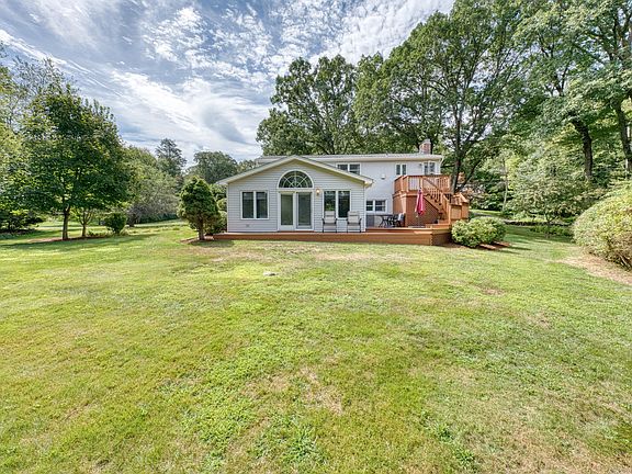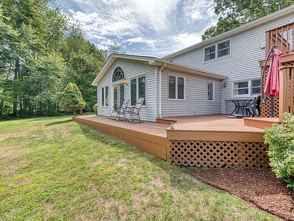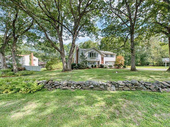 Quietly situated in a desirable Tolland subdivision, this beautiful raised ranch sits on a 0.62acre lot with mature trees and a fieldstone wall. Step into a sunlit living room with gleaming hardwood floors and a bow window. The eat-in kitchen features cherry cabinetry, stainless steel appliances, and wide board flooring. Three bedrooms and a full bath occupy the main level. A cathedral ceiling family room boasts skylights, Palladian window, recessed lighting, and French doors. The lower level adds a cozy den, home office, and half bath. Outdoors you'll find a wooden deck and patio perfect for entertaining, a level backyard, and a Kloter Farms shed. Upgrades include a newer roof (2015), Marvin windows, a 200amp electrical service, generator hookup, new front and garage doors, a 2016 deck, and recently installed central air, boiler and oil tank. With a full walkout basement, this move in ready home combines comfort and convenience. Located near schools, parks, and commuting routes, it's ready for its next chapter.