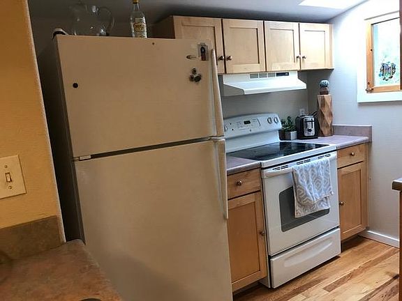 1 BR HISTORIC MANITOU COTTAGE "TREE HOUSE" Available for Rent. Available June 1st: High up on a hill with amazing mountain views from the many windows & private porch of this well-maintained & fully restored historic Manitou cottage with working fireplace. One bedroom. One full bathroom. Open concept with kitchen and living room combined. Beautiful maple wood floors throughout. Kitchen has maple cabinets & opens to the living room for spacious feeling. High vaulted ceilings with sky lights. Original working stone fireplace with tiled hearth. Bedroom has wall of windows looking down over the town & oversized closet with loft for storage. Tiled tub & shower in bathroom with window to backyard. Front porch area with space for BBQ & seating. Garden planting area in backyard with flat space for more outdoor seating. Very clean & excellent condition. Energy-efficient windows, well insulated & reasonable utility bills. Additional storage area under the house. Plumbing & electrical work all updated. House is approx. 410 sq feet. Entire lot is 2250 sq feet so lots of outdoor areas to enjoy. This home is walking distance to parks, cafe's, bus stop, laundry mat, hiking trails & shops in downtown Manitou, yet on quiet & secluded street. Quick access to Highway 24 & I-25. No smokers. Small dogs OK for extra charge. 1-year lease required. $950/month rent. Security deposit ($950), 1st month's rent and last month's rent must be paid when lease is signed. Tenant pays water bill, trash pickup & all utilities. References, proof of income, criminal background check & credit check required. 15 Cedar Lane in Manitou Springs. First month rent, Last month rent, and Security Deposit required when lease is signed = $2,850.