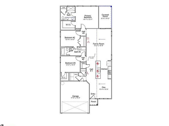 This single-story home includes 3 bedrooms and 2 bathrooms. This open concept floor plan has a flex space, kitchen and living room that are nice and spacious with a vaulted ceiling. The primary bedroom (with 5' walk-in shower) and its walk-in closet are just off the family room. Two spare bedrooms share a second bathroom, and a laundry room is just inside the two-car garage. The kitchen is complete with a GE, stainless steel appliance package including a electric range, built in microwave, dishwasher and garbage disposal.