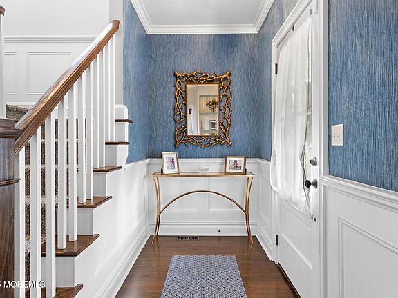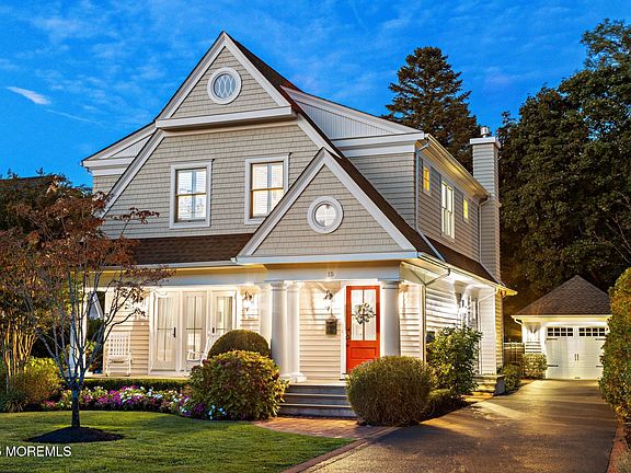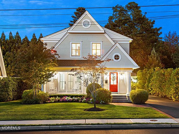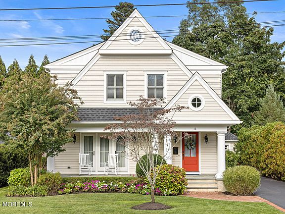 This New Shore Colonial is centrally located in Fair Haven and loaded with charm. This impeccable home offers its owners 4 bedrooms and 3 full and 1 half baths. Designed by Forbe's Top 200 American Residential Architect, Michael Wu and built in 2015 by Kolarsick Builders, this home offers generous living space with modern living in mind. The open staircase leads you directly to the fully finished basement through to the top floor which hosts 4 bedrooms and 2 full baths. Upon entering the home, the foyer leads you left into an open and formal family room with French doors leading to the bluestone front porch. The living room also leads you through the butlers pantry and bar to the open kitchen, breakfast nook and living room with coffered ceilings and gas fireplace as well as direct access to the back patio and yard. The kitchen is adorned with gorgeous marble throughout, shaker-style cabinetry, and anchored with stainless appliances. The breakfast nook offers a vaulted ceiling and wraparound oversized windows flooding the space with natural light. The side entrance to the home off the driveway opens to the well appointed mudroom which leads directly to the half bathroom and bisects the staircase and family areas.