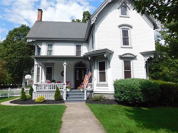 Timeless elegance describes this Victorian treasure! Comfort and coziness have been incorporated in the midst of all of this home's grandness. This immaculate home, right in the heart of the Village of Sherburne, has stunning woodwork throughout, high ceilings and floor to ceiling windows (with original plantation shutters). The home has been completely updated, while preserving the historical features. The gourmet kitchen is open and spacious with new cabinetry and stainless steel appliances. The kitchen has an eat-in area, opening to a huge rear deck, for the ultimate in entertaining. A cozy family room is located just off the kitchen area. Formal living room (with custom wood-burning fireplace) and formal dining room, as well as front parlor. Relax on the front porch, and listen to the soothing sounds of the fountain located in the small park across the street. Updated bathrooms. Lots of closets and other storage, plus the attic! Newer windows and furnace contribute to economical heating costs. Low-cost municipal electric. Located on a double lot, completely fenced in. Carriage barn houses two cars and has an upstairs area for hobbies or storage.