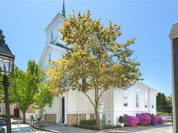 Enjoy living in a cherished part of Newport history (c1735) in the heart of downtown Newport walking distance to numerous restaurants, shops, and the harbor whilst benefitting from the tranquility of a quiet side street. 15 Clarke Street was built as the Second Congregational Church, whose best-known minister was Dr Ezra Stiles, who then became President of Yale. Listed on the National Register of Historic Places, the building was thoughtfully reimagined into condo residences and has been thoughtfully renovated to include modern conveniences such as air conditioning. This unit offers three levels of elegant living space and a sunny south facing terrace. Enter into the den which can be used as an occasional second sleeping area with an adjacent full bathroom. The gorgeous south facing two-story stained-glass window infuses the space with natural light and historical character and is a wonderful focal point for this level and the second level where the inviting living room with electric fireplace provides ambience, dining area, and kitchen are located. The third level boasts a sun-drenched, south-facing mahogany terrace offering distant water views of the harbor and providing a private sanctuary for relaxation. The primary bedroom with an ensuite bathroom completes this level. The unit also benefits from a garage space. There is also a shared outdoor yard area with a firepit and seating, creating a perfect space for outdoor gatherings and relaxation.