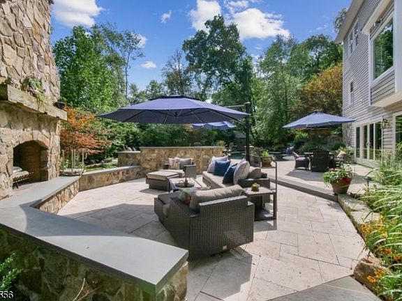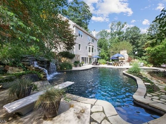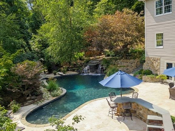 Escape to Beauty and Tranquility! Entertain in a PRIVATE backyard oasis complete w pond-like pool, waterfall, hot tub, built-in grill, commanding fieldstone fireplace, Sonos SoundSystem and Extensive land scaping and lighting. Control outdoor functions from your phone. Bring the gathering indoors thru a wall of sliding doors and enjoy the custom granite top bar and family room area. A full bathroom and gym area also grace this memory making level. A Grand 2-story foyer welcomes you to the LR Library and DR. A sun drenched Great Room serves as a true gathering spot w a gas stone fireplace. EIK has a breakfast bar and commercial 5 burner oven. Large pantry, laundry and powder room complete this floor. Upstairs master suite and dressing area are incredible! Plus Much More! Only 1hr West of NYC! A Simply Magnificent Staycation Home!
