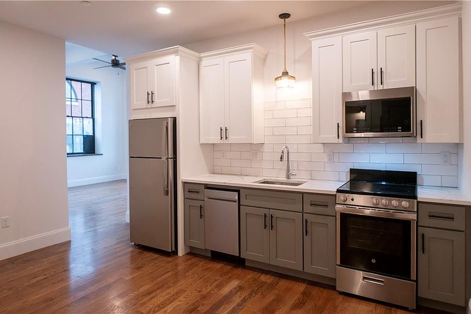 This two bedroom unit is available July 1st. This former elementary school has been fully renovated into modern apartments while keeping the charm of the schoolhouse. Units feature open floorplans, soaring ceilings, large windows, new kitchens with quartz countertops and soft shut cabinets, and central air. The building features basement storage and laundry, one assigned parking spot per unit plus ample guest parking. Tenants are responsible for electric, cable and wifi; hot water, water/sewer, trash and snow removal are included. No pets please. This corner unit is located on the second floor, and has two bedrooms and two full bathrooms, with an ensuite in the main bedroom, plus in-unit laundry.