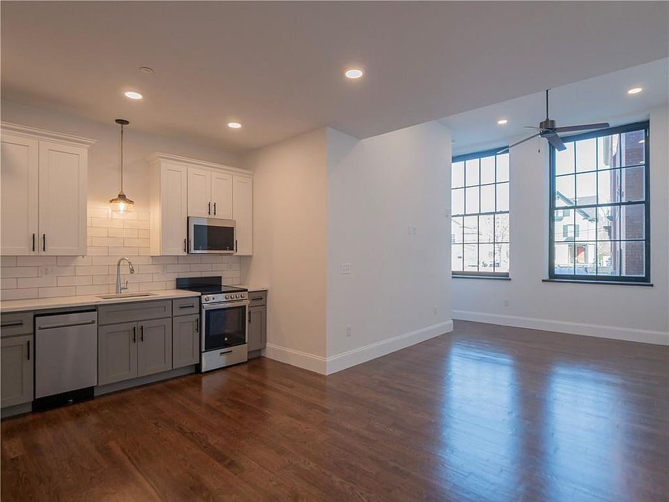 Introducing The Calvert, now available for leasing! This former elementary school has been fully renovated into modern apartments while keeping the charm of the schoolhouse. Units feature open floorplans, soaring ceilings, large windows, new kitchens with quartz countertops and soft shut cabinets, and central air. The building features basement storage and laundry, one assigned parking spot per unit plus ample guest parking. Tenants are responsible for electric, cable and wifi; hot water, water/sewer, trash and snow removal are included. No pets please. This north facing first floor corner unit has one bed and one and a half bath plus laundry in unit.