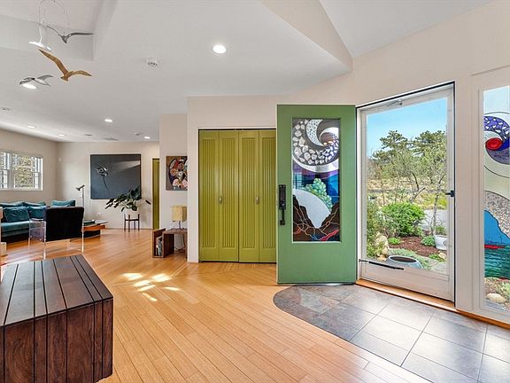 Located at the end on a secluded cul-de-sac, this contemporary gem, built in 2005, offers a blend of sophistication and comfort. The meticulously designed home boasts captivating sunset and forest vistas from its rooftop deck and features two plus bedrooms. Inside, you'll find an inviting layout characterized by airy, open style living on a single level, complemented by a modern chef's kitchen ideal for entertaining fireside. Crafted with concrete siding and enhanced by radiant floors, gas fireplaces, central air, generator, heated garage, central vacuum, well water, alarms, and eco-friendly technologies, this residence seamlessly merges luxury with efficiency. Outside, four decks, a charming garden, and a unique rooftop solarium leading to a secluded sunken deck provide outdoor retreats. Seasonal water views extend to the ocean and Herring Cove, above and beyond the National Seashore Park treetops. This private neighborhood offers the best of all worlds: privacy and easy access to all