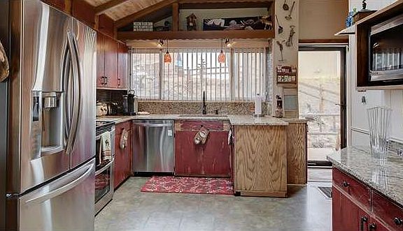 Charming Colorado Cabin Cute & cozy remodeled home with mountain & sunset views from the wraparound deck & patio below. This home looks like it was on an HGTV show! New wood-burning insert in walkout basement and wood-burning stove in dining area to keep you warm on those chilly evenings. 900+ sq ft