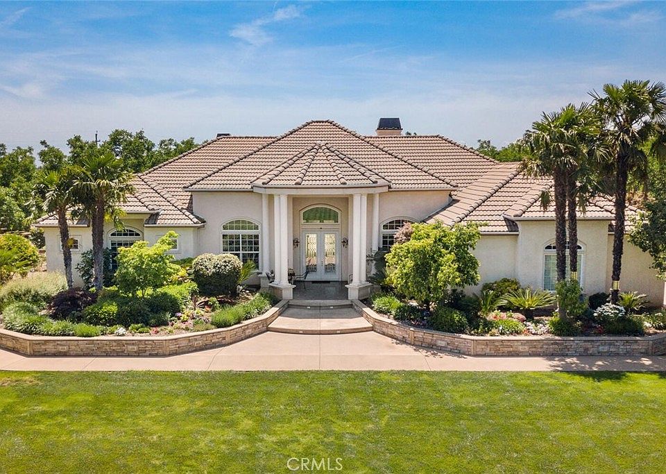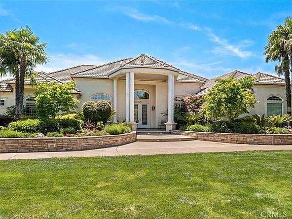 Nestled within the lush embrace of its very own producing walnut orchard in the picturesque town of Durham, this bespoke estate embodies unrivaled elegance and offers an array of awe-inspiring amenities. From the moment you arrive, you are welcomed by an atmosphere of refined sophistication, with soaring ceilings, lightly painted walls, and a grand entrance that beckons you into a serene formal living room, adorned with French doors that frame the immaculate backyard. Crafted to delight and entertain, the expansive family room seamlessly flows into the fully equipped kitchen, ensuring the chef remains an integral part of any gathering. It features granite countertops, wood cabinetry, stainless steel appliances, a double oven, a built-in wine rack, and a centerpiece island crowned with a gas range and a large breakfast bar, perfect for indulging in delectable snacks or enjoying conversations with the chef. For larger gatherings, the separate dining room awaits just off the entrance, offering a spacious haven to accommodate friends and family for unforgettable meals. The primary bedroom, fit for royalty, boasts expansive dimensions, and grants private access to the backyard. Complete with a breathtaking fireplace, built-in storage, a personal beverage fridge, and a spa-like bathroom that leaves one awe-struck. It flaunts two walk-in closets, granite countertops, a soaking tub, his and her vanities and an oversized tiled walk-in shower adorned with dual shower heads. Other details include recessed lighting and ceiling fans throughout, 3 generously sized guest bedrooms with private en-suite bathrooms, a spacious separate laundry room, an attached 3 car garage and the list goes on. Step into the magnificent backyard, a summer oasis where enjoyment knows no bounds. It offers a glistening in-ground custom pool and accompanying spa, while the vast covered tiled patio with ceiling fans and a kitchenette features the perfect place for relaxation. Elevated garden beds allow for the cultivation of your very own bountiful harvest of fruits and vegetables. This extraordinary property extends across over 7 acres, bestowing upon you a private cell tower, OWNED SOLAR, a flourishing walnut orchard, a 3000 sq foot shop with a loft and bonus room with a kitchenette. Positioned in Durham, a mere stone's throw to Butte Creek Country Club and the captivating charms of downtown Chico. This custom retreat is the perfect place to enjoy life!