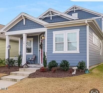 BETTER THAN NEW!!! Active 55+ community quaint, cottage style home, two car garage, spacious bedrooms/Bathrooms/Walk in closets. Wood flooring, upgraded lighting, granite countertops. Lovely cottage style home in Clayton's Premier active 55+ community - The Walk at East Village. The home features a high level of comfort including a deluxe kitchen with granite countertops, tile backsplash, custom cabinets with soft close doors and drawers, two car garage has plenty of storage along with an upgraded epoxy coated concrete floor, plus floored attic for additional storage. Attractive ceiling fans are in all bedrooms, living room and front porch. The two year old home is nestled in the only phase of the community with attached garages in the back. Lushly landscaped front sidewalks and cozy front porches allow residents to engage/interact with one another. The Walk at East Village also offers residents a variety of amenities. The beautiful spacious clubhouse, saltwater pool, pickleball courts, putting green, work out gym, billiards room, craft room and more. THE HOME AND COMMUNITY ARE MUST SEE!!!