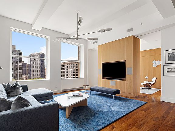 Enter into a generous entry foyer leading to a spacious living/dining area with oversized windows facing south, overlooking Madison Square Park and the southern city skyline. With soaring 11'8" ceilings, this great room is open and airy with different areas for lounging, entertaining and/or dining. The adjacent open chef's kitchen is outfitted with top-of-the-line stainless steel appliances, a wine fridge, a vented hood, marble countertops and plentiful storage and countertop space along with counter seating.