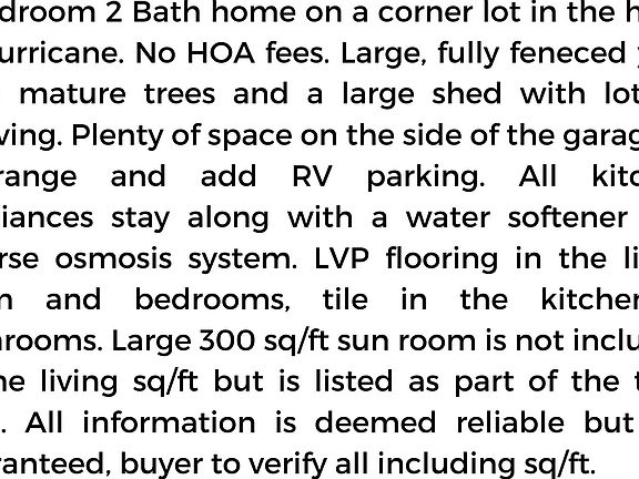 3 Bedroom 2 Bath home on a corner lot in the heart of Hurricane. No HOA fees. Large, fully fenced yard with mature trees and a large shed with lots of shelving. Plenty of space on the side of the garage to rearrange and add RV parking. All kitchen appliances stay along with a water softener and reverse osmosis system. LVP flooring in the living room and bedrooms, tile in the kitchen & bathrooms. Large 300 sq/ft sun room is not included in the living sq/ft but is listed as part of the total sq/ft. All information is deemed reliable but not guaranteed, buyer to verify all including sq/ft.