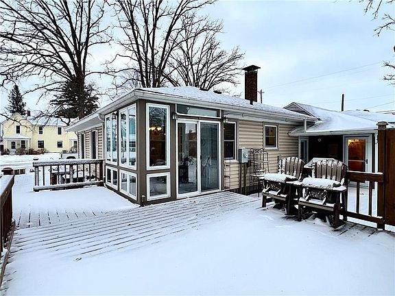 This beautifully cared for Rice Lake home features the perfect living space for every season! Thoughtfully updated home with gorgeous hickory hardwood floors, luxurious tile, flowing kitchen with breakfast bar, and generously sized formal dining and living areas. The inviting four season room with wrap around deck offers year-round relaxation and peeks of Rice Lake waterfront. In addition, the home perfectly blends comfort and function with a great location and plenty of room for guests and hobbies! The lower level is complete with a secondary living space and finished with a full kitchen, bathroom, and storage area. The attached oversized garage features space for your vehicles and lake toys, handy workshop area, and finished with warm in-floor heat! The home also offers a spacious fenced lawn, mature trees, and beautifully planted perennial beds. The great neighborhood location is just a short stroll to the newly revitalized downtown Rice Lake area, waterfront walks, and city parks!
