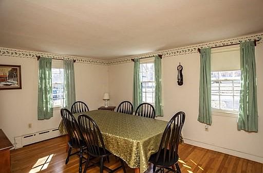 Looking for a home with a detached garage for repair work, hobbies, or storage? This 1 acre property comes with a separate garage that has a heater and stairs to the second floor. The main house has a versatile floor plan with the ability to have 1 or 2 bedrooms on the first floor and 2 on the second floor (1 currently used as a family room). The eat-in kitchen has plenty of cabinet space and leads out to a 3 season cathedral ceiling porch. The living room is light and bright and boasts hardwood flooring as does the dining room. Two full baths, one with tub & shower and one with shower. The walkout basement includes a wood stove and workshop area. Relax on the back deck. 1 car garage attached to the sunroom. Conveniently located just minutes from shopping, Route 3 (old Exit 9), restaurants, beach, T-Station and much more.