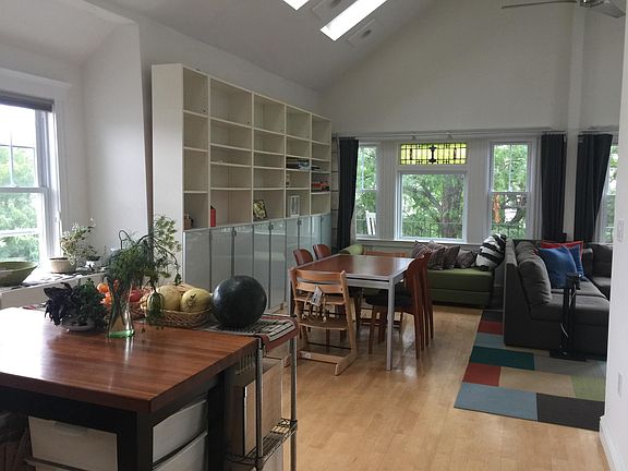 This sun-drenched top floor 2BR unit is located on a tree-lined street within walking distance to Davis Square and Tufts University. It features a fantastic open floor plan that is great for entertaining. 14' high vaulted ceilings with 7 skylights in living room, dining room and kitchen, lets in abundant natural light throughout. The thoughtfully renovated kitchen features granite countertops, stainless steel appliances (gas range, refrigerator, dishwasher, microwave), solid 48" cherry cabinets. The renovated bathroom includes beautifully tiled shower and soaking tub. Other features include gorgeous Southern "Sugar-Red Pine" hardwood floors throughout, beautiful period stained-glass windows in living room, newer energy efficient windows, front deck, and 4 Season rear porch, in-unit laundry, central air & heat, plenty of storage in the unit and in the basement, 2 tandem off-street parking on the driveway. Steps to Tufts University, Professors Row & Powderhouse Blvd, and public transportation. Easy access to Route 2 and I93, convenient to Davis Square Red Line T, Teele Sq, and Alewife. Photos from previous occupant. Tenants pay one month broker fee. By appointment only.