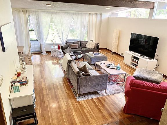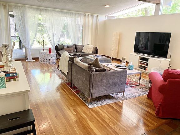 Mid-Century Modern living in West Newton Hill. 5 bed/2.5 bath contemporary single family home is one of a kind. Bright & spacious family room w/fireplace open to the dining area & 3 season porch which overlooks beautiful views of the lush backyard. The kitchen includes stainless appliances, dishwasher, disposal & microwave as well as large windows. All 5 bedrooms are a good size & offer large closets w/closet systems, including the master, which also includes its own modern en suite full bathroom. Can also be set up to include an "in-law" living area as 2 of the bedrooms have the option to flow into each other. Other amenities include: Hardwood floors throughout, central AC, 2 car garage, laundry room w/& large machines as well as basement storage. The bi-level patio, large level yard & breathtaking views add the character of this home. Less than 1/2 mile from Newton North HS, 1.2 mi. to both West Newton & Newtonville Commuter Rail, restaurants, shops & more!