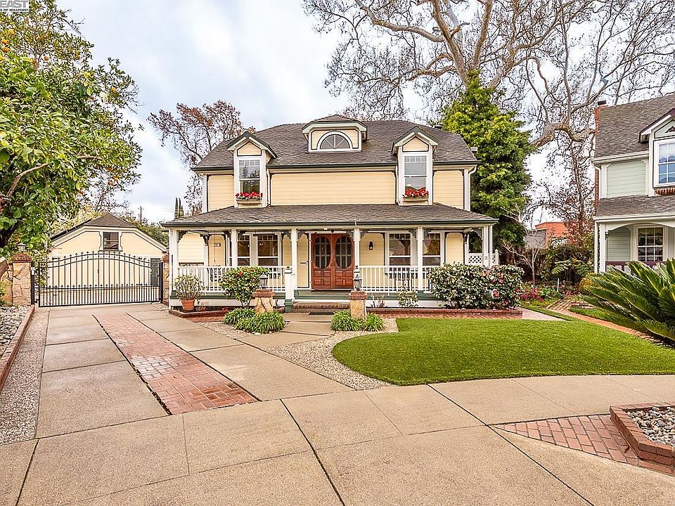 Nestled in a picturesque neighborhood, this exquisite Victorian-style home seamlessly blends timeless elegance with contemporary luxury. This property offers ample room on its large lot for both indoor comfort and outdoor relaxation. The covered porch beckons you to unwind. Enter through double doors into the foyer, where modern accents and hardwood floors create a timeless feel. The heart of the home is the stunning kitchen, featuring Shaker-style cabinets, quartz countertops, and high-end stainless-steel appliances, including a 6-burner gas stovetop and double ovens. With a spacious island and a generously sized pantry, this kitchen is a chef's dream. Retreat to the spacious master suite with a spa-like bathroom for ultimate relaxation. The parlor has been transformed into the 4th bedroom, and the dining room into a den. Outside, a detached 2-car garage and expansive driveway provide ample parking, while an electronic driveway gate ensures privacy and security. Solar panels (owned) and three EV charging stations offer modern sustainability and convenience. Conveniently located near Central Park, Lake Elizabeth, shopping & golf course, this home offers easy access to major commute routes, incl. BART, highways 880, 680, and 84. Don't miss this exceptional opportunity.