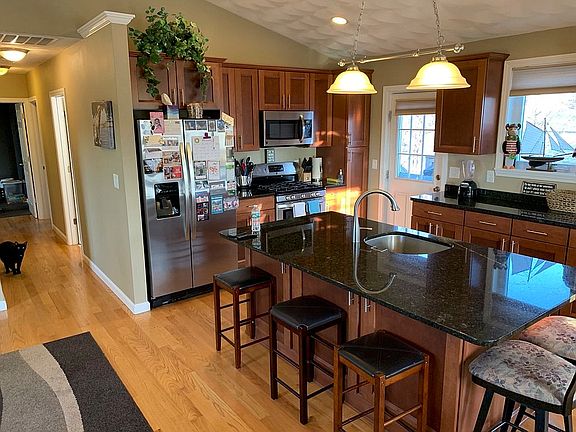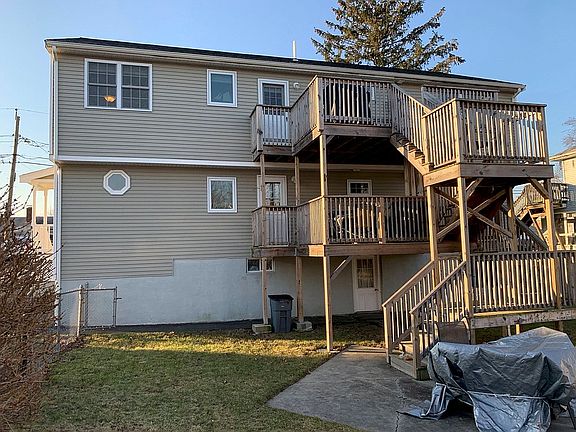 Lovely open concept kitchen, dining, and living area sporting a high vaulted ceiling and direct access to spacious back deck with gorgeous views. Three good sized bedrooms with 1.5 bathrooms and in-unit washer/dryer. Granite counter-tops in both kitchen and bathrooms, stainless steel appliances, hardwood floors throughout, and numerous large windows for plenty of natural lighting. Exclusive storage/work room in basement, direct access to attic with pull-down ladder in-unit, exclusive ownership of half of the very large backyard, and owned, off-street parking.
