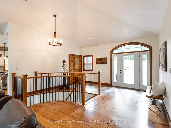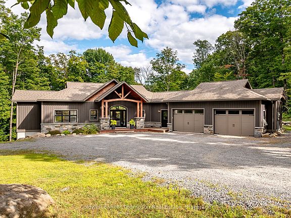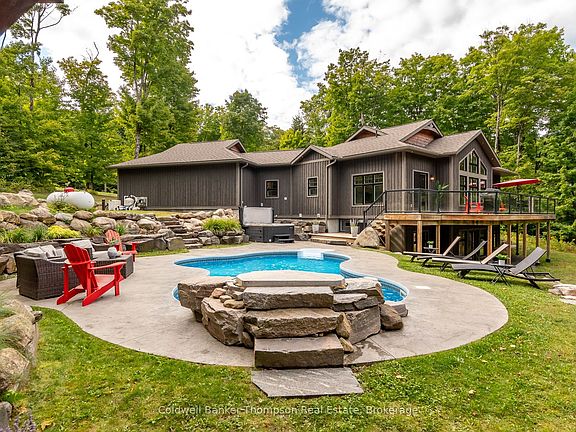 Welcome to this remarkable property, tucked away on a private, year-round road. It spans almost 4 acres across both sides of the road, offering space, privacy, & convenience just minutes from town. The outdoor setting is spectacular & designed for both relaxation & entertaining. Professional landscaping surrounds an inground pool with a cascading stone waterfall. A hot tub area & covered lounge invite endless summer enjoyment. Expansive decking overlooks, creating the perfect backdrop for lively gatherings, quiet afternoons in the sun, or evenings under the stars. Here is a property where lasting memories are made outdoors as much as in.Stepping inside, the home continues to impress with a sprawling executive bungalow layout crafted for comfort & style. A spacious foyer welcomes you to the bright living room. A wall of windows frames the outdoors, while a striking stone fireplace adds warmth & charm. The chefs kitchen is a showpiece. It offers high-end appliances, abundant storage, a large island, & beverage fridge. From the dining area, walk out to the expansive deck & extend your living space into the outdoor paradise. The main floor is anchored by a generous primary suite with direct deck access, a walk-in closet, & a luxurious 4-pc ensuite with glass shower & double sinks. A guest bedroom & 4-pc bath provide comfort for visitors. A large mudroom & laundry area, with inside entry to the oversized double garage, adds everyday convenience. Descend the curved staircase to the fully finished walkout lower level, where a massive rec room with an electric fireplace creates the ultimate gathering place. This level also offers 3 guest bedrooms, a 3-pc bath, a cozy office, & a bonus room currently used as a gym. A spacious utility/storage room completes the design, ensuring both function & flexibility.This exceptional property blends refined living with an incredible outdoor oasis, offering the perfect balance of privacy, luxury & convenience