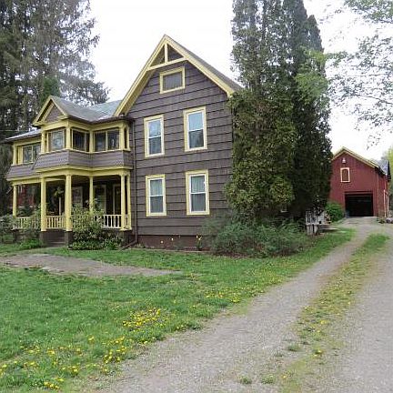 Beautiful Victorian home with 1+ acre on quiet village st is easy walk to P.O., restaurant, school, library and community ctr. It has 4 BR, 2 full baths, lg kitchen, dr, parlor and lr around an original Chestnut staircase. Plenty of storage, utility room, hot tub room, & 3 season & screen porches. Fully weatherized 3 yrs ago, cable ready, municipal water, oil & wood/coal boilers for radiator heating, oak floors & great woodwork throughout, walkup attic & lg cellar. 2 story barn w/electric subpanel (currently wood shop) & 1 car garage. Within 30 mins of Ithaca, Watkins, Owego, Horseheads & PA.